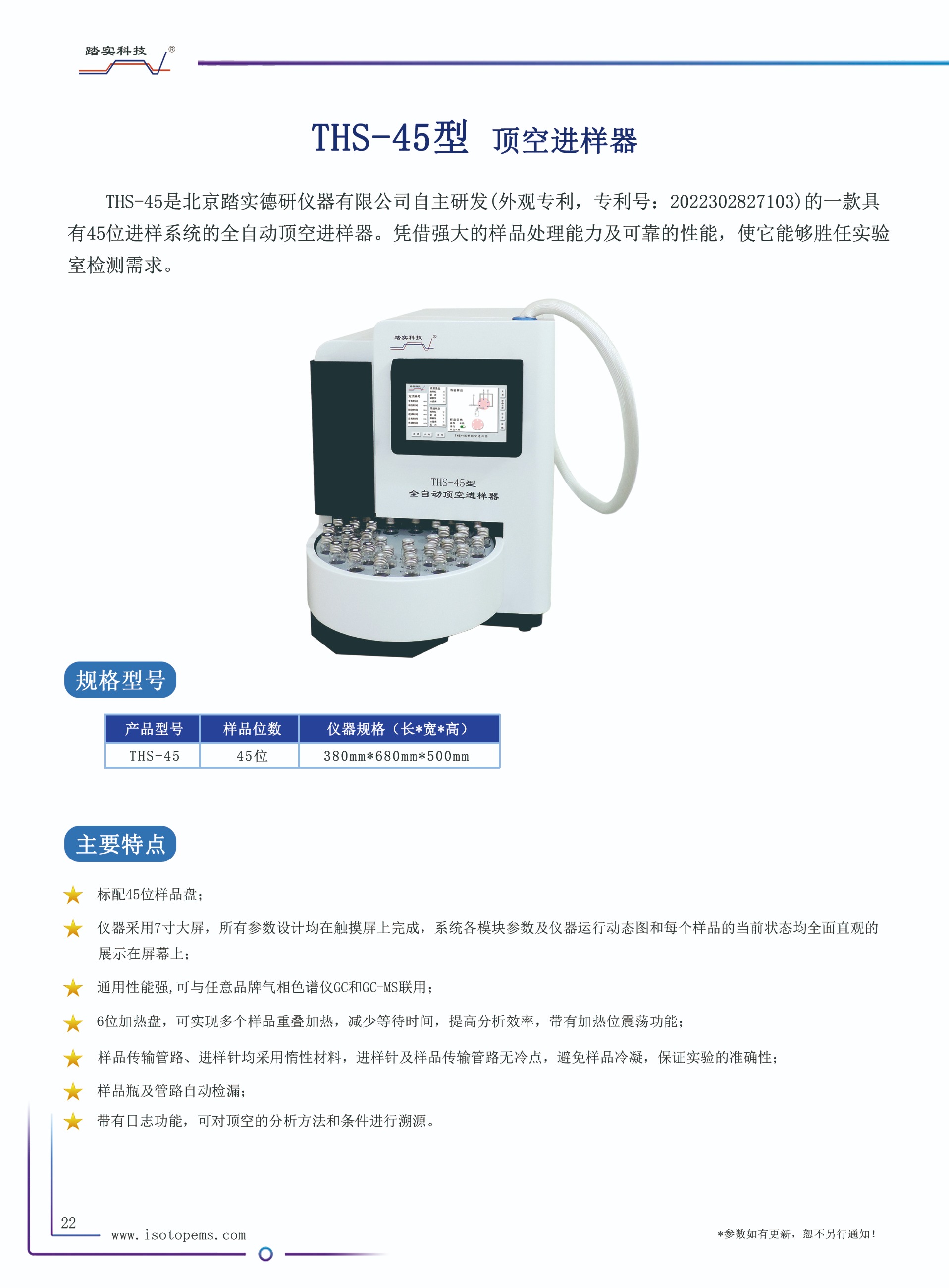 THS-45型頂空進樣器是一款具有45位進樣系統的全自動頂空進樣器。廣泛應用于醫療衛生,環保,石油化工,食品行業,制藥等領域。該儀器符合HJ 736-2015土壤和沉積物揮發性鹵代烴的測定 頂空氣相色譜-質譜法》、《HJ 741-2015 土壤和沉積物  揮發性有機物的測定 頂空/氣相色譜法》、GA/T 842-2019  血液酒精含量的檢驗方法》、《HJ 1067-2019水質 苯系物的測定 頂空/氣相色譜法》、《HJ 810-2016水質揮發性有機物的測定 頂空氣相色譜-質譜法》等標準。